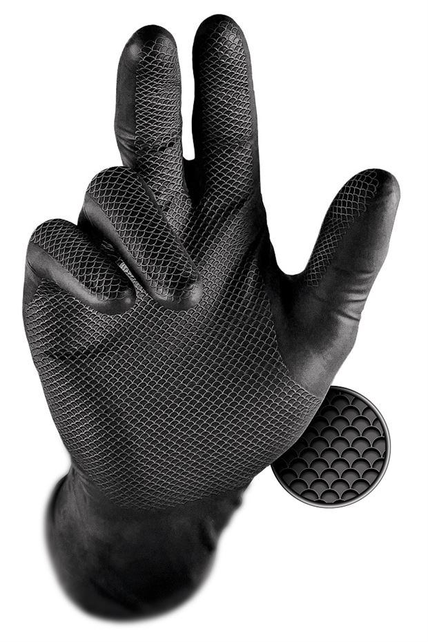 Grippaz nitrilové rukavice vydržia až 5x dlhšie; sú vyrobené z extra odolného a pružného materiálu;ktorý zaručuje vysoký stupeň ochrany pred roztrhnutím. Spĺňajú všetky prísne normy na ochranu pred biologickým materiálov; vírusmi podľa (EN ISO 347-5:2016); chemikáliami (EN ISO 374-1/Type B) a spĺňajú aj potravinový štandard.. Špeciálna patentovaná protišmyková vrstva a špeciálna vonkajšia štruktúra „rybích šupín“; zabezpečí bezpečný úchop aj mokrých a klzkých predmetov. Balenie obsahuje 50 ks rukavíc; farba čierna; hrúbka 0;15 mm.